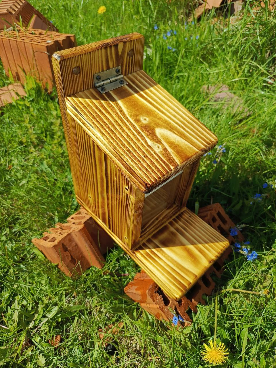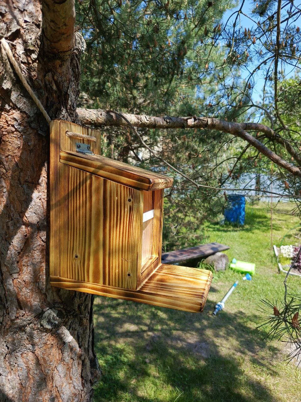 Кормушку купил. Хотя можно в принципе самому сделать, ибо принцип понятен. Любой ящик с крышкой на петле будет работать. Главное чтобы крышка весила не слишком много, и выступ здесь конечно хотелось-бы побольше так как взрослой белке тут может быть тесновато. Промазал олифой кормушку, пропитал маслом соприкосающиеся поверхности крышки и ящика, и даже демпферы на крышку прилепил чтобы белки грохоту не наводили.
