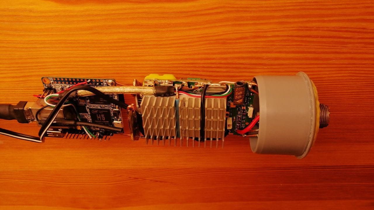 As you can see this one is pretty simple design with radio ontop of an OrangePi unit. Actually this huge heatsink is a bit overhead here and OrangePI H5 CPU is lot warmer than transceiver, even with a cycle like 90%TX 10%RX. So in a ver.2 I've decided to put two small heatsinks on both of them. Real challenge here is not in heatsinks actually, but in a small sealed compartment which 50mm tube is: no matter how many heatsinks inside, they will just heat-up internal space.