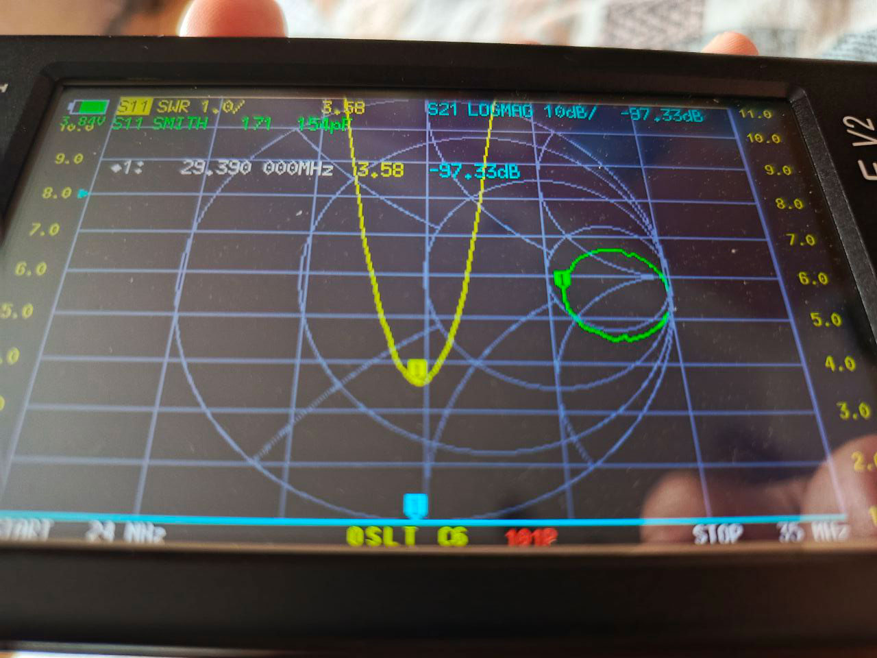 На графике КСВ (коэффициент стоячей волны) имеем 29 МГц вместо заявленных 27 МГц. При том что к антенне приложена рука в качестве противовеса, ибо сибишные портативные антенны без противовеса весьма грустные (а с ним перестают быть портативными).