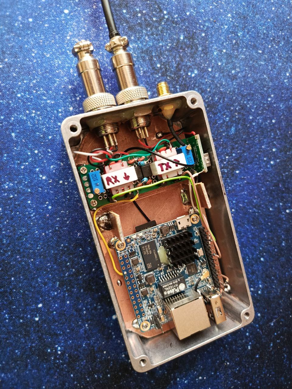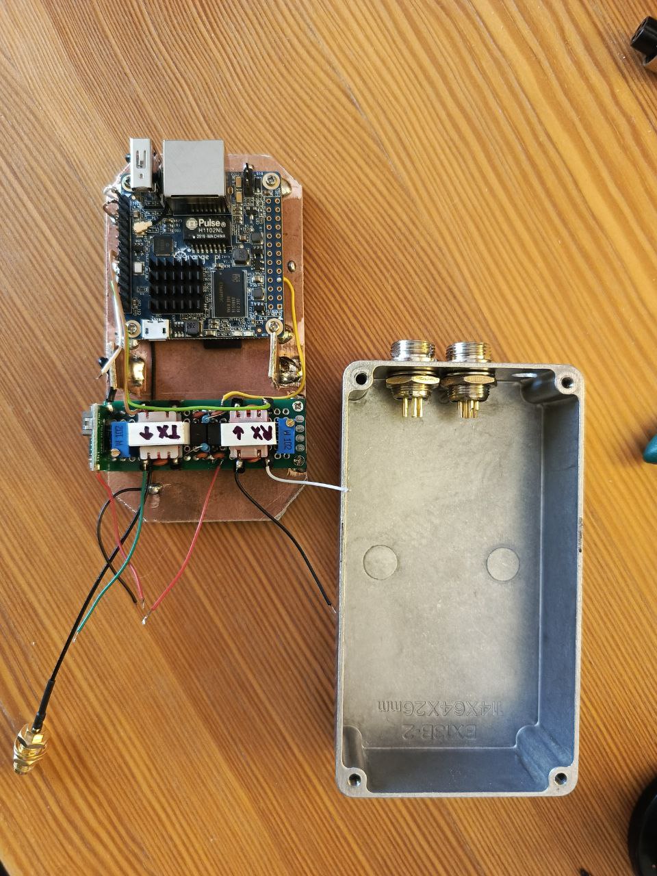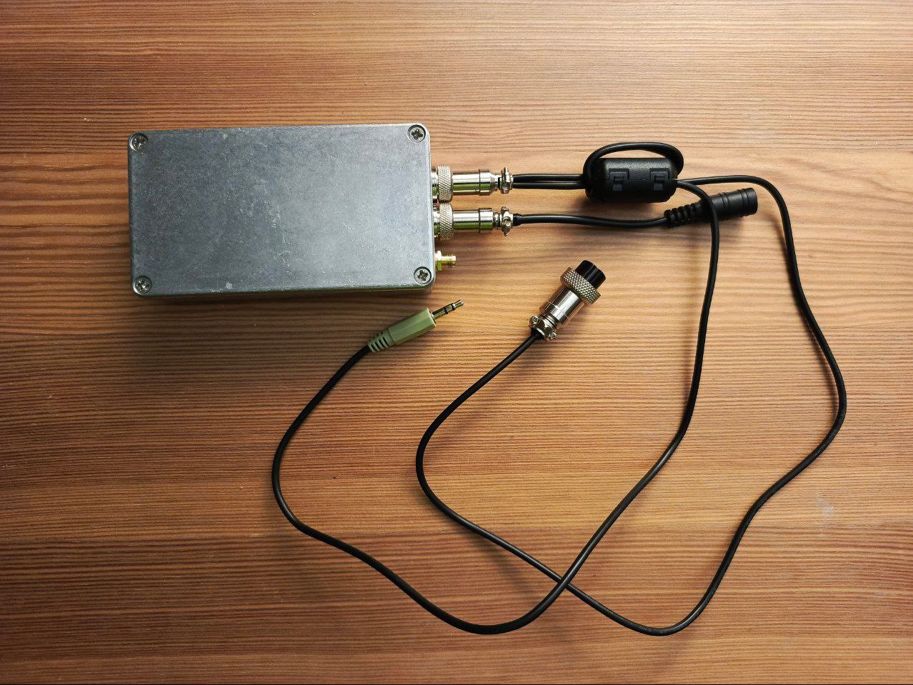 Питание коробочки спряталось на плате развязки. Задница у этого Mini-360 экранирована, электрически мусор на переменный резистор не несёт. Катушка его вся убрана в феррит, и магнитно не дотягивается до трансформатора TX. Финально была проложена терморезинка между катушкой и корпусом, немного мелких доработок, проклеивание стыков проводов к разъемам и плате согласования (потому-что предполагается что я могу захотеть это вынимать, например для доступа к езернету, и провода не должны отваливаться от всего этого дела). Ну и вот, готовое устройство: